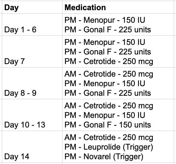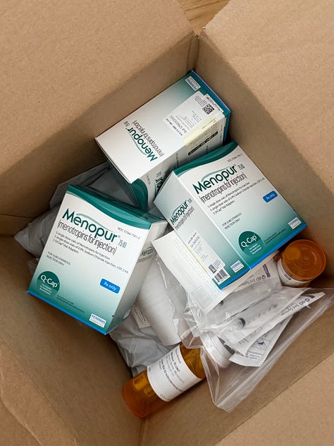 Initial consult where we cover goals (how many kids, etc), complete a transvaginal ultrasound and bloodwork to get baseline metrics (AMH, egg count), understand the process, and explore options (eggs vs embryo, medication options, etc.). Based on my profile, my doctor predicted an egg retrieval of 8-12 eggs, which at the top end would give me a 88% chance of successfully conceiving 1 child (based on their calculator). This felt promising. My preservation goal was to have enough eggs set aside for 1 child as a safety net (although my family goal is to have 2 kids). I was given different timelines for starting/ending the procedure and ultimately went with the next available cycle, so I started 1 week after initial consult.