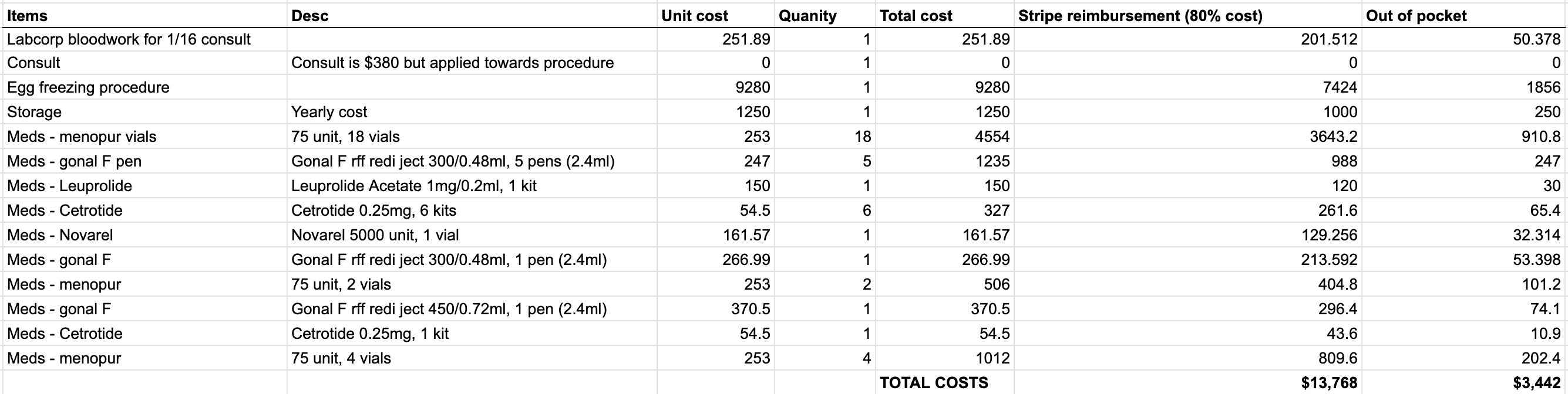 Note that embryo freezing comes with higher costs and I believe my employee benefit also unlocked more discounts with the clinic and pharmacy.