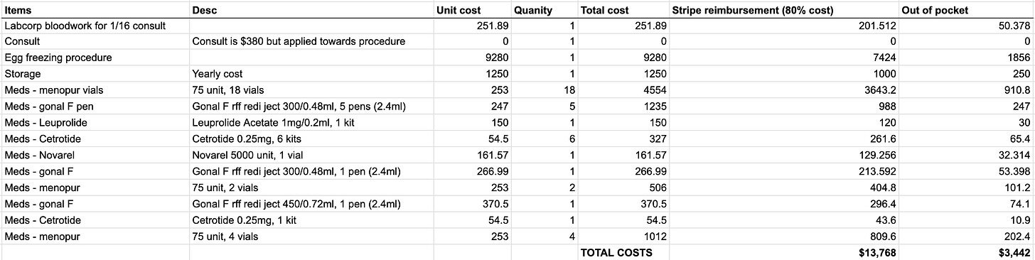 80% cost coverage - Stripe has, for as long as I can remember, covered up to 80% of fertility preservation costs, up to a certain lifetime maximum value. It would be a waste to not use this benefit, IMO.